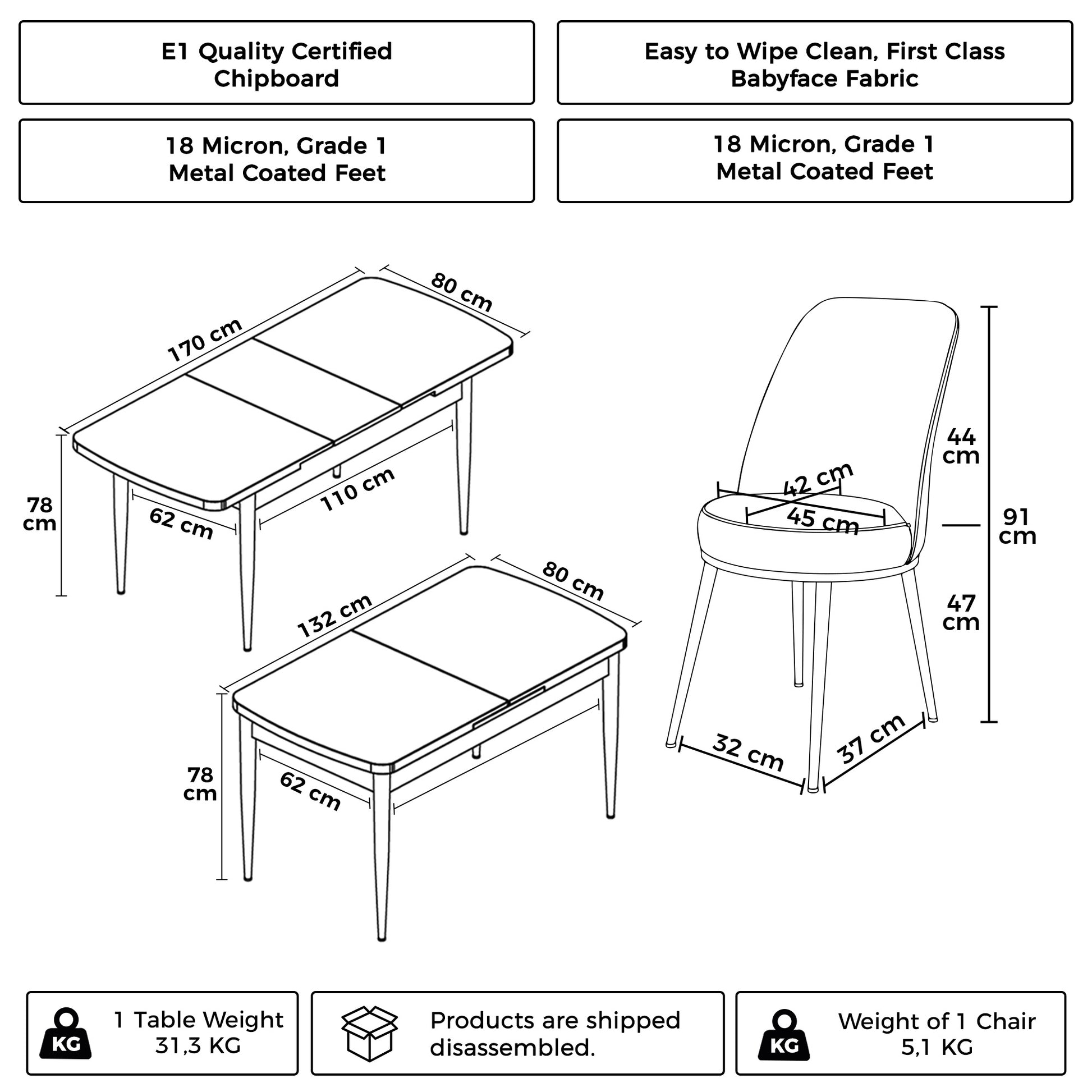 Extendable Table Design: Easily transition from a compact 132 cm length to a spacious 170 cm to accommodate extra guests.
