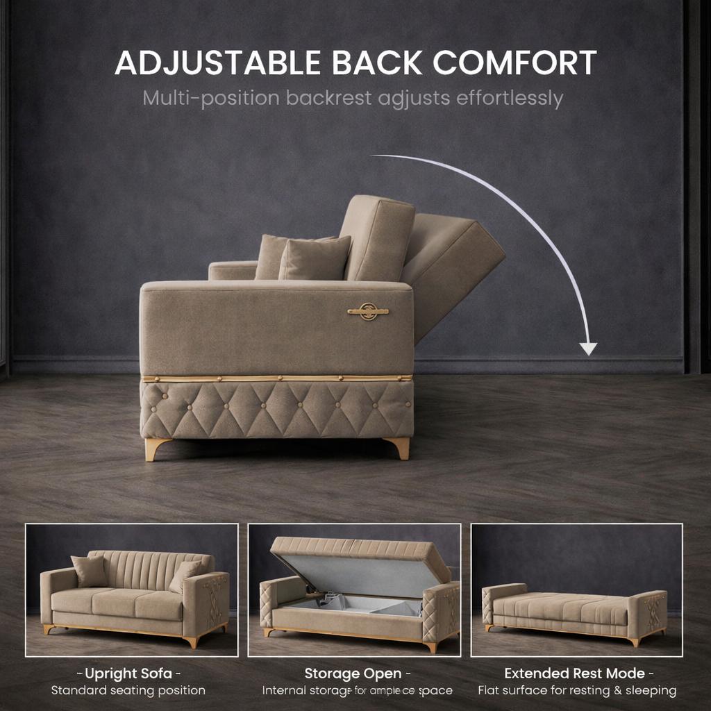 Istanbul Series, This stylish and functional sofa combines comfort, durability, and elegance. Upholstered in premium Boyteks Setra series fabric, it features high-density foam padding, a robust spring system, and a spacious pull-out bed function. With carefully selected materials such as 500 g recycled blend felt, 18 DNS quilted foam, and 1000 g/m² hard felt, this sofa ensures long-lasting support. Decorative and hidden legs add both aesthetics and stability, while its 180x105 cm bed size offers extra sleeping space for your guests.